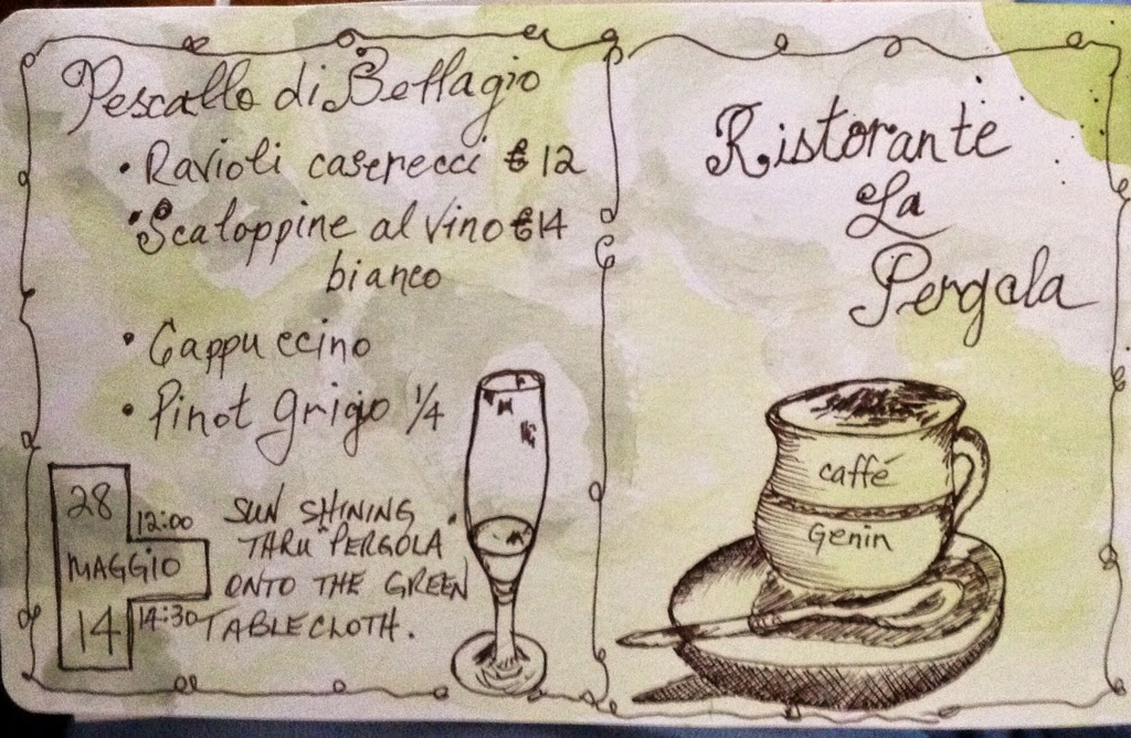 It is such a pleasant spot that we decide to stay for a late lunch. This picture below tells the story of our meal. We are eating Italian style, slowly with wine and lots of time.