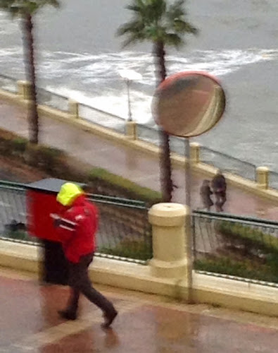 Along the walk in front of our apartment is this fish eye mirror for cars to see as three roads converge. There are stop signs but nobody pays them any heed. We have seen a few close calls....but it's just how they drive. I'm not sure how much of a traffic safety sign this is but it sure is a favourite for walkers to stop and take selfies. This fellow was walking along with a broken umbrella which he just dumped in the garbage can. Then he stopped, adjusted his bright yellow hoody and took a selfie. I was a bit too late to catch him in action but he is now checking the picture on his cel as he continues on down the street.
